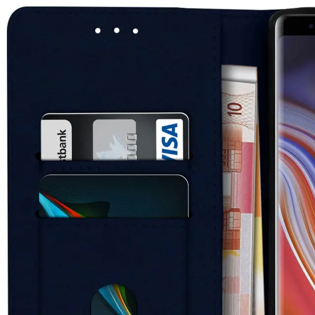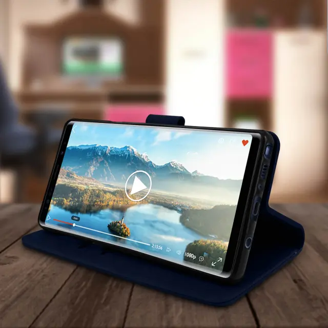 Etui za denarnico, posebej oblikovan za Samsung Galaxy Note 9. Umirjeno in elegantno oblazinjenje iz ekološkega usnja z ponošenim videzom in šivanimi zaključki. Po meri oblikovana, prilagodljiva in odporna podporna prevleka iz silikonskega gela. Predeli za shranjevanje kartic, vgrajeni v podlogo zavihka.
