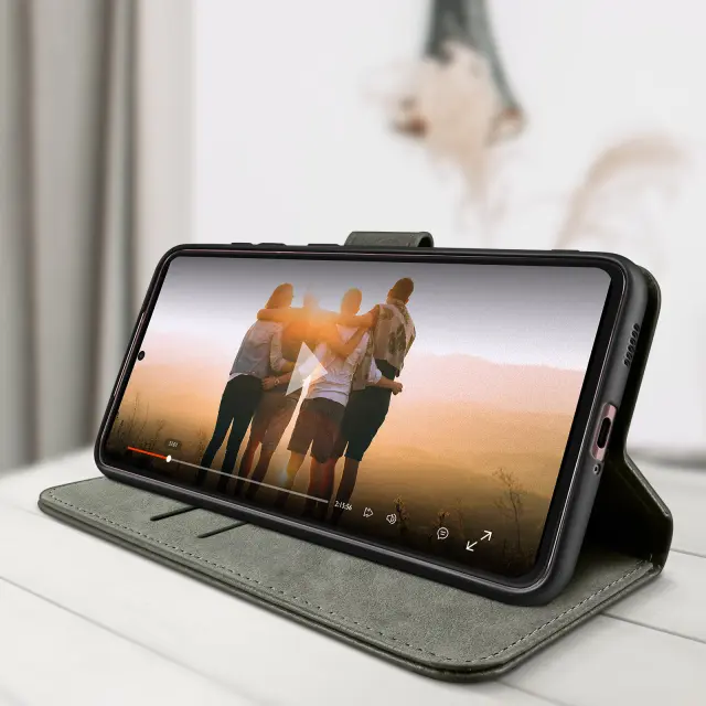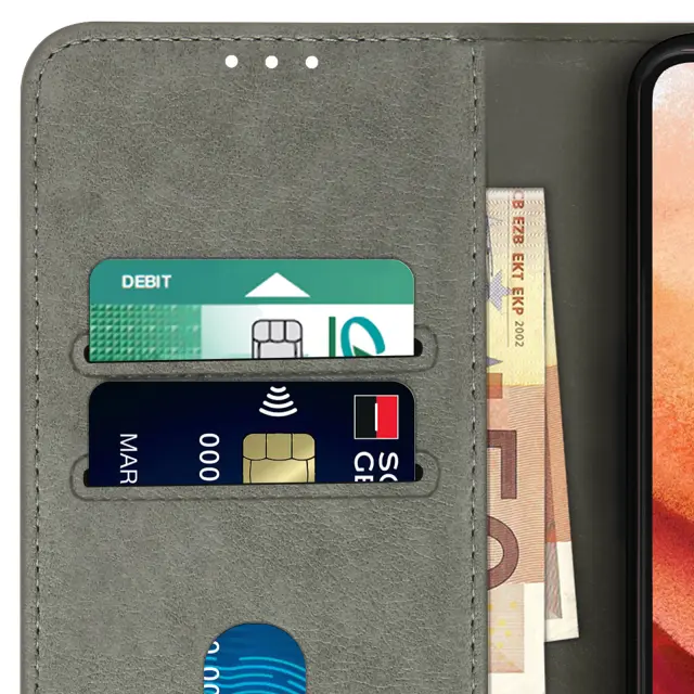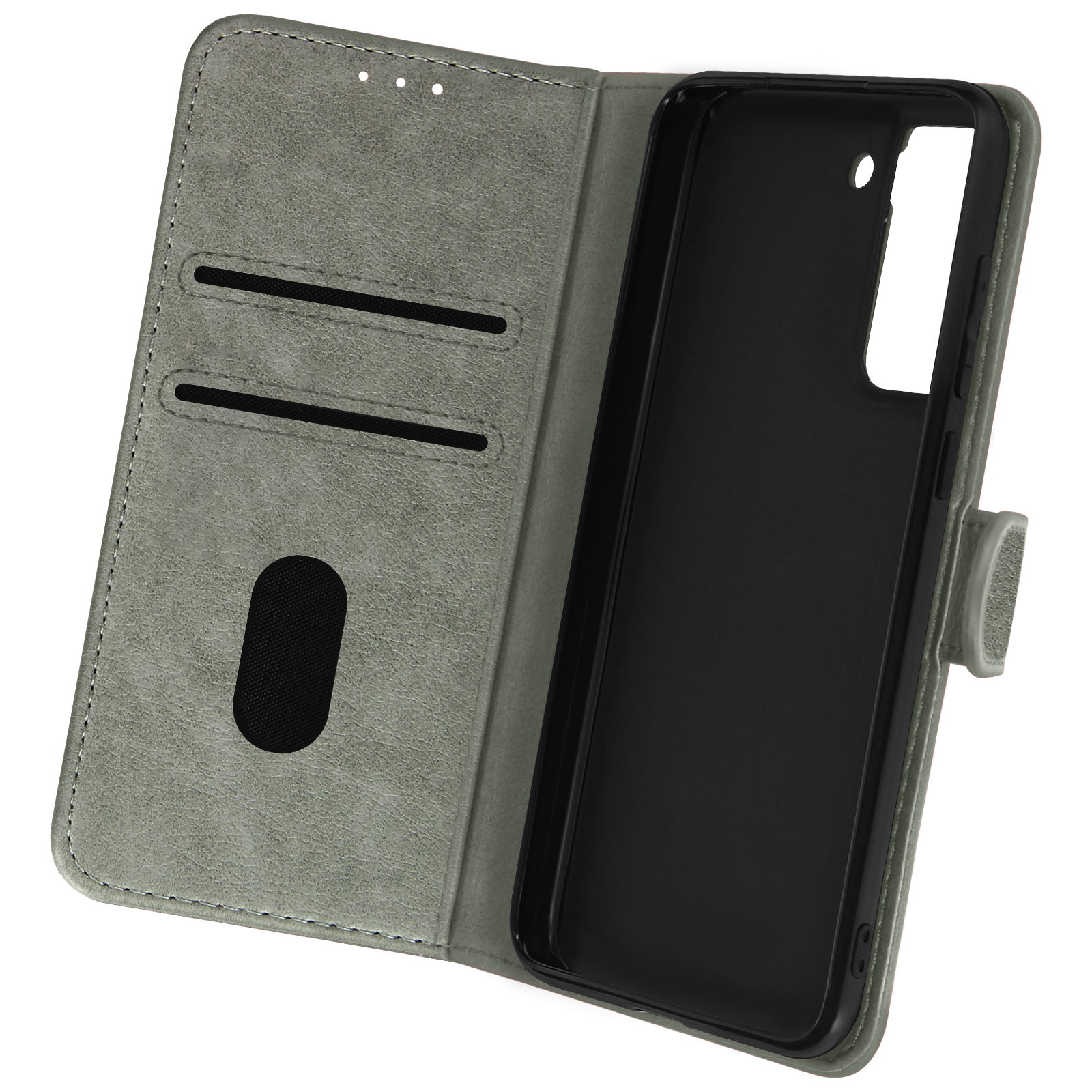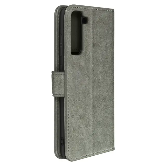 Etui Folio Case z držalom za kartico, posebej oblikovan za Samsung Galaxy S21 FE - siv. Etui z magnetnim zavihkom za zaščito vašega pametnega telefona. Denarnica, integrirana v podlogo zavihka. Vodoravna podporna funkcija za udobno gledanje videoposnetkov.