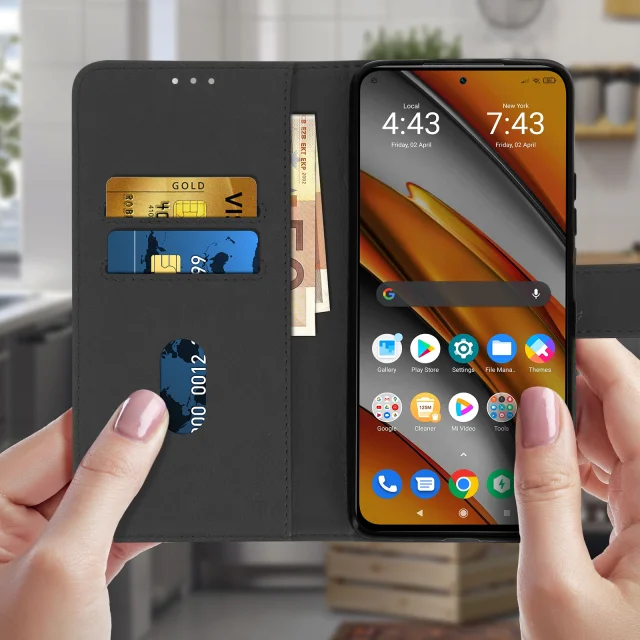 Preklopna torbica posebej zasnovana za Xiaomi Poco F3/Mi 11i. Učinkovito ščiti vaš pametni telefon pred vsakodnevnimi udarci in praskami. Znotraj zavihka so vgrajeni namenski predelki za vaše kartice. Horizontalna podporna funkcija za udobno gledanje vaših fotografij in videoposnetkov.