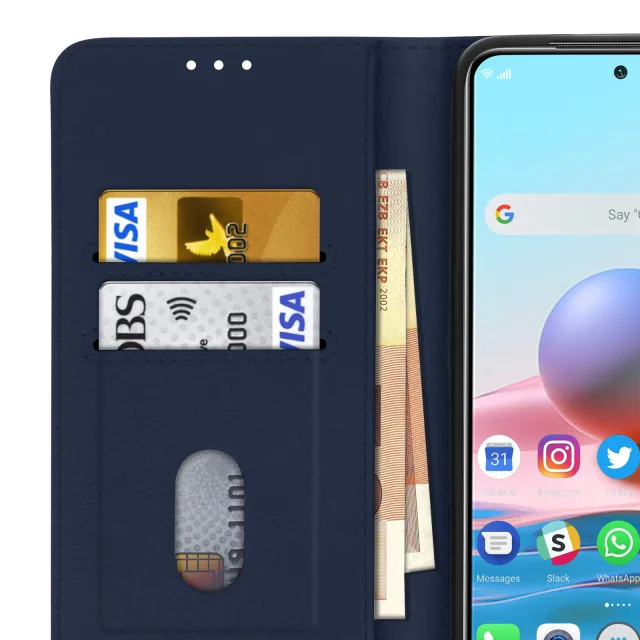 Preklopna torbica posebej zasnovana za Xiaomi Redmi Note 10/10s. Učinkovito ščiti vaš pametni telefon pred vsakodnevnimi udarci in praskami. Znotraj zavihka so vgrajeni namenski predelki za vaše kartice. Horizontalna podporna funkcija za udobno gledanje vaših fotografij in videoposnetkov.
