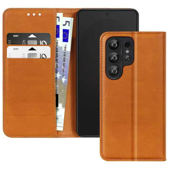 Folio denarnica ovitek za Galaxy S26 Ultra efekt usnja z video stojalom, Svetlo rjava