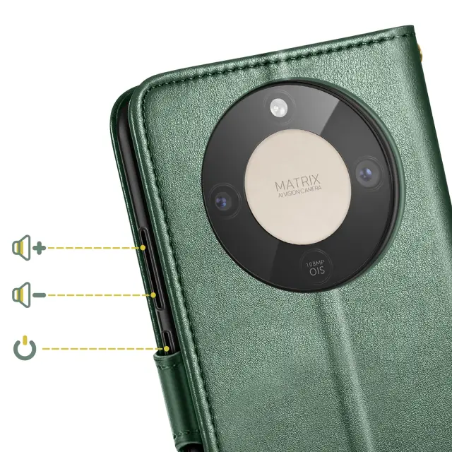 Denarnica za Honor Magic 8 Lite s popolno zaščito in varnim zapiranjem. Vgrajena denarnica: 2 držala za kartice, reža za fotografije in stranski žep za zapiske in račune. Jezik z zlato magnetno sponko za trdno zaprtje zavihka za vsakodnevno uporabo. Stabilno zložljivo stojalo za video, video klice in prostoročno navigacijo v ležečem načinu.