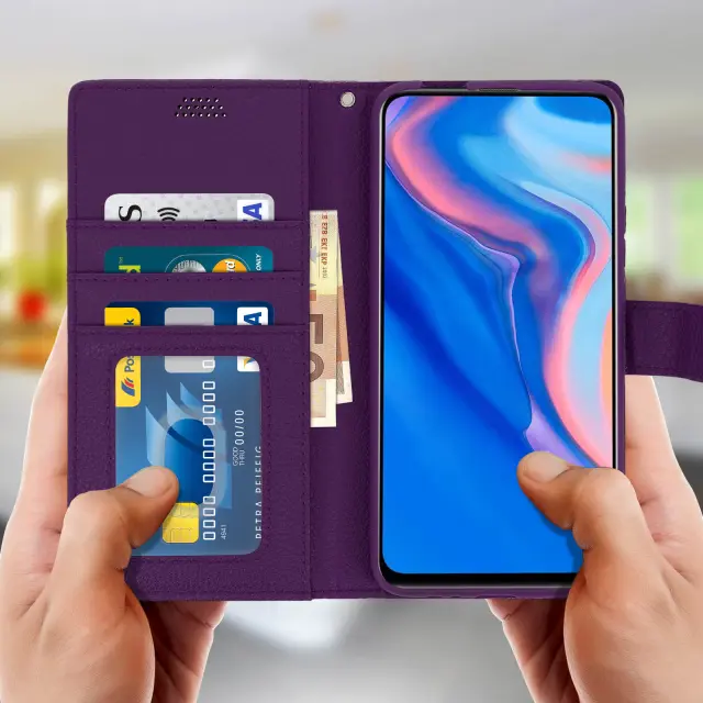 Vsestranska zaščita, zasnovana posebej za Huawei P Smart Z , Honor 9X in Huawei Y9 Prime 2019. Učinkovito ščiti vaš pametni telefon pred vsakodnevnimi udarci in praskami. Eleganten dizajn z oblazinjenjem iz ekološkega usnja z zrnatim učinkom in šivanimi zaključki. Več predelkov za kartice v podlogi z zavihkom.