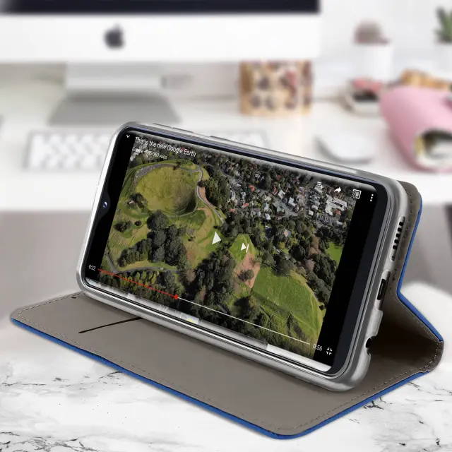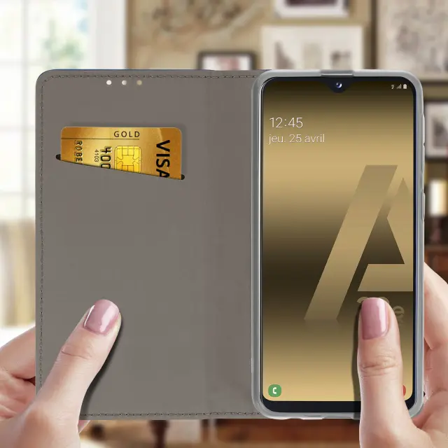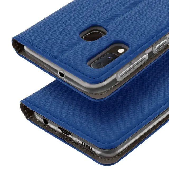 Zaščitna folija, zasnovana za Samsung Galaxy A20e. Oblika iz umetnega usnja s šivanim zaključkom združuje robustnost in umirjenost. Učinkovito zaščitite svoj telefon pred udarci in vsakodnevnimi nesrečami. Notranja silikonska torbica, ki se popolnoma prilega obliki vašega telefona.