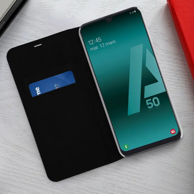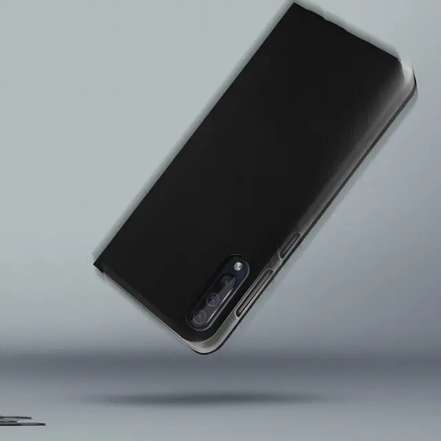 Zaščitna torbica posebej zasnovana za Samsung Galaxy A50. Trezen in eleganten dizajn s prevleko iz eko usnja z učinkom satena. Izkoristite namenski prostor za shranjevanje v podlogi z zavihkom, da vanj vstavite kartico. Zaščitni pokrov iz polikarbonata po meri.