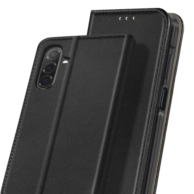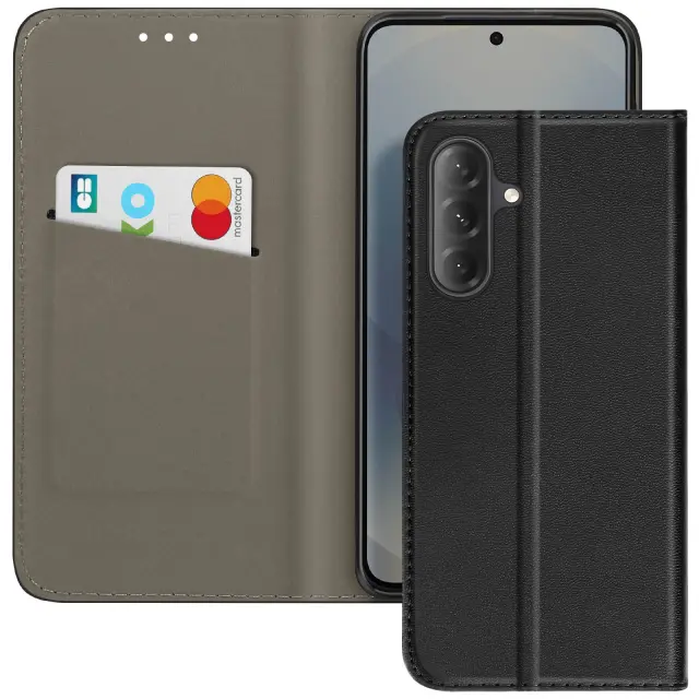 Prefinjeno usnjeno ohišje z elegantnimi šivi, združljivo z Galaxy S25 FE. Diskretna integrirana reža za bančno ali osebno izkaznico. Funkcija video podpore je idealna za filme, serije in prostoročne klice. Prilagodljiva notranja lupina, ki absorbira udarce, z natančnimi izrezi za priključke in kamero.