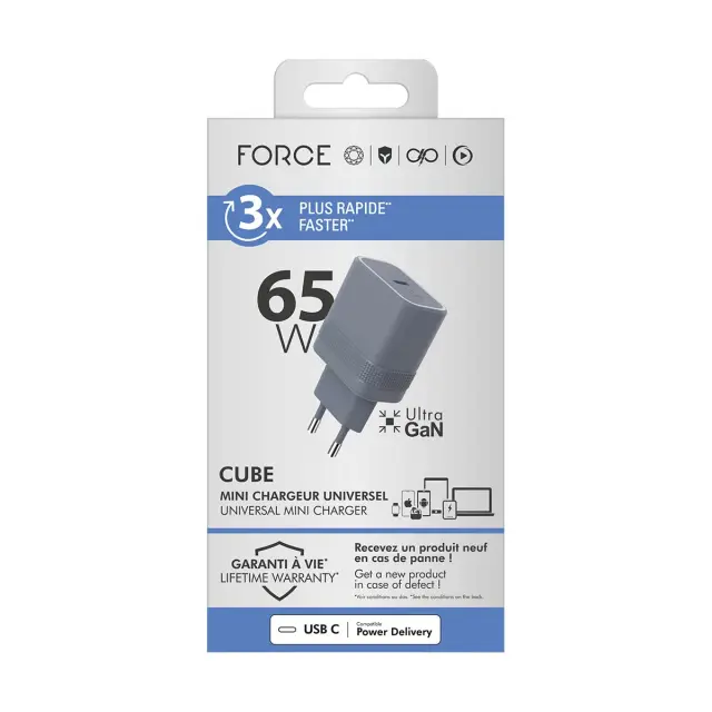 65W USB-C Power Delivery za hitro polnjenje pametnih telefonov, tabličnih računalnikov in prenosnih računalnikov, ki so združljivi z USB-C. Tehnologija UltraGaN za kompakten, prostorsko varčen in energetsko učinkovit kockast format. Široka združljivost protokolov: PD 3.0, PPS, QC4.0, Apple 2.4A, PE 2.0 in SCP za polnjenje, optimizirano za naprave. Ekološko odgovorna zasnova iz 100-odstotno reciklirane plastike z nadzorovanim ogljičnim odtisom 1,78 kg CO2e.
