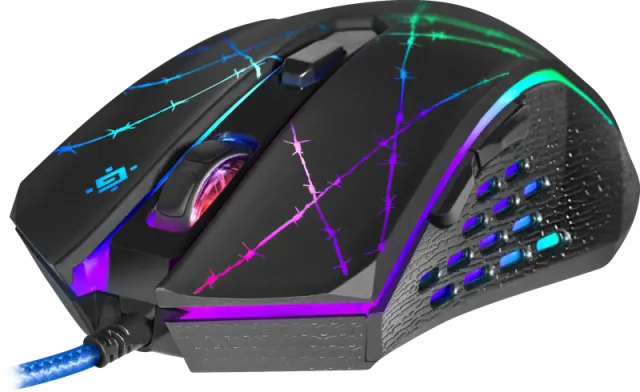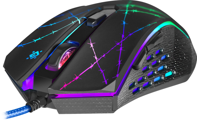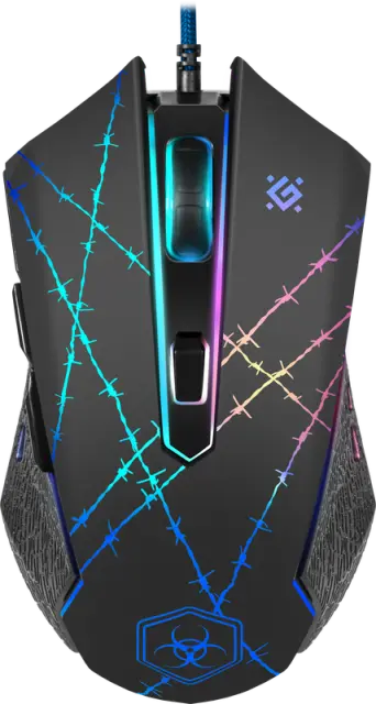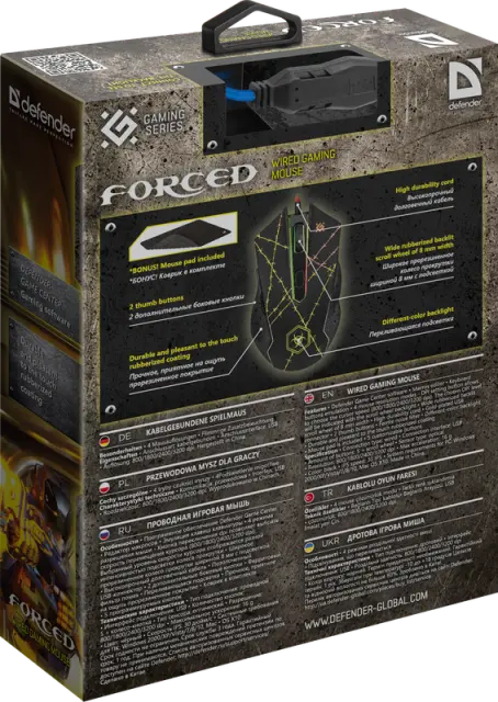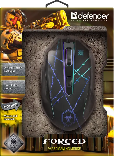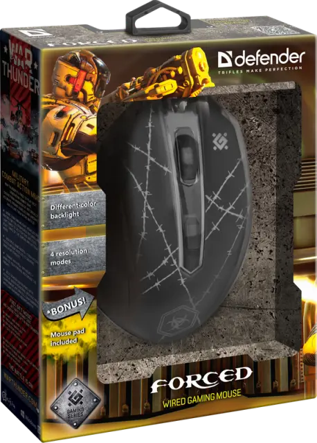 Žična miška Defender OPTICAL FORCED GM-020L je opremljena z vzdržljivim kablom z močno pletenico iz tkanine in feritnim filtrom. Model je igralni manipulator z visoko (3200 dpi) največjo ločljivostjo. Eden od gumbov (skupaj jih je šest) se uporablja za spreminjanje ločljivosti. Obstaja možnost programiranja petih gumbov.