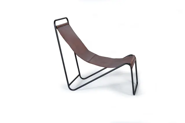 Fotelj oblazinjen v naravnem usnju in rjavi kovini