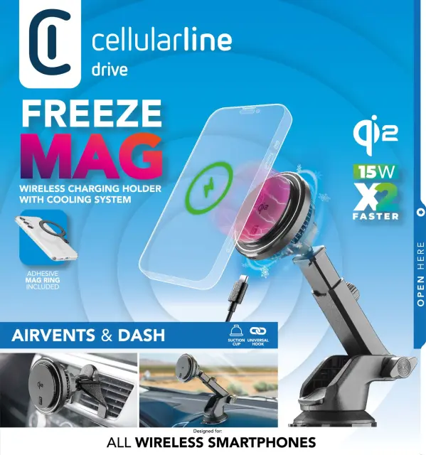 FREEZE MAG je avtomobilski nosilec, opremljen z notranjim sistemom hlajenja, ki učinkovito preprečuje pregrevanje pametnega telefona.