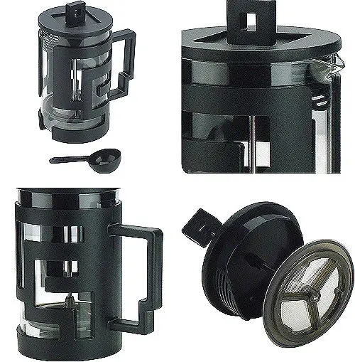 Zunanje ohišje je iz plastike, mrežica iz jeklene tkanine, silikonsko tesnilo za zmanjšanje usedlin kave med pripravo.