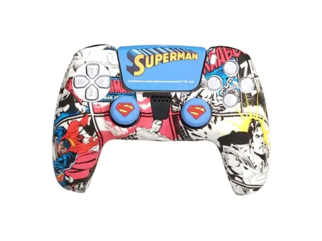 FRTEC – komplet po meri DC, uradna licenca, silikon + ročaji + nalepka, sledilna ploščica, združljiva s Playstation 5 (SUPERMAN) Spremenite svojo igralno izkušnjo z uradnim paketom superjunakov FR-TEC za vaš DualSense. Njegov dizajn, ki ga navdihuje strip, vas bo spomnil na najtemnejše epizode superjunaka. Vključuje: - Silikonsko ohišje: gladek material z žametnim občutkom za bolj udobno, varno in pravo izkušnjo. - Ročaji krmilne palice: vtisnjen logotip za boljši oprijem med igrami. - Nalepka sledilne ploščice: Zaščitite sledilno ploščico vašega DualSense in jo hkrati prilagodite. Silikon + ročaji + nalepke za sledilno ploščico: celoten paket za PS5 DualSense za zaščito in prilagajanje krmilnika. Odličen oprijem: gladka površina silikona in oblika ročajev zagotavljata izkušnjo oprijema za izboljšanje vaše učinkovitosti v igrah. Zaščita sledilne ploščice: Zahvaljujoč nalepki, vključeni v paket, boste prejeli sledilno ploščico zaščiteno in prilagojeno. Nedrseča površina: Material, iz katerega je izdelan, ima lastnosti, ki preprečujejo občutek potnih rok in uživajo v igranju iger v najčistejši obliki. Uradna licenca DC: značka enega najbolj priljubljenih superjunakov v vesolju DC. Inovativna oblika: estetika, ki bo spremenila vaš DualSense.
