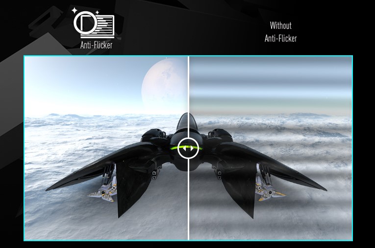 Zasloni splošnih monitorjev imajo običajno hitrost utripanja približno 200-krat na sekundo, ki je s prostim očesom neopazna, vendar lahko sčasoma povzroči utrujenost. MSI-jeva tehnologija Anti-Flicker, ki jo je potrdil TÜV Rheinland®, z zmanjšanjem utripanja zagotavlja zelo udobno gledanje.