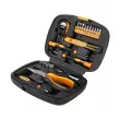 Kovček je izdelan iz trpežnega materiala, ki ščiti orodja pred udarci, prahom in vlago. Ima tudi priročen ročaj za enostavno prenašanje. Notranjost kovčka je razdeljena na več predalov, kar omogoča organizirano shranjevanje in enostaven dostop do orodij. Vsako orodje ima svoje mesto, kar vam omogoča, da hitro najdete pravo orodje za vsako nalogo.