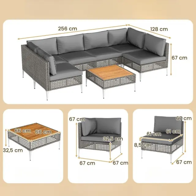 Dimenzije vsakega kotnega kavča: 67 x 67 x 67 cm (D x Š x V)