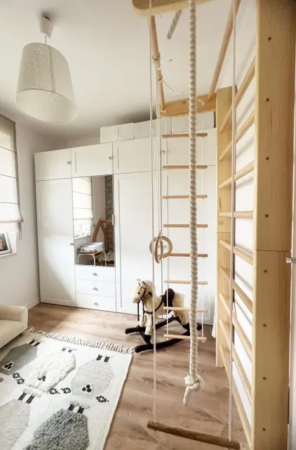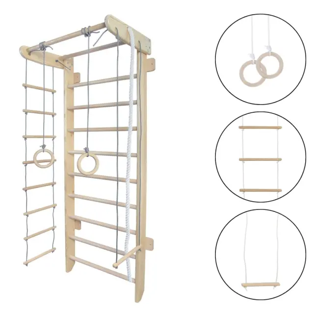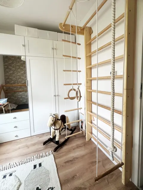 Gimnastična lestev Numi - vadbeni set, ki ne sme manjkati v sobi razposajenega malčka. Zasnovana je tako, da izpolnjuje zahteve tudi najbolj izkušenih navdušencev nad plezanjem - tako odraslih kot otrok. Ta komplet sestavlja kar 6 elementov, ki poleg lestve vključujejo še palico za dvigovanje, gimnastično vrv, trapez, vrvno lestev in gimnastična kolesa. Lestev Numi je poslastica za vse male akrobate in na kratko pravi opičji gaj!