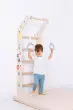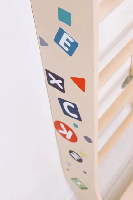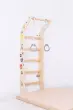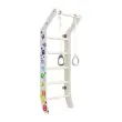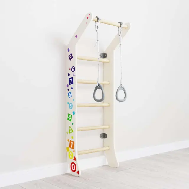 Komplet je priročno pritrjen na steno. Vadbena lestev ne zavzame veliko prostora v otroški sobi. Za razvijanje otrokovih motoričnih sposobnosti so v kompletu vključena akrobatska kolesa. Okolju prijazni materiali so varni za malčke.