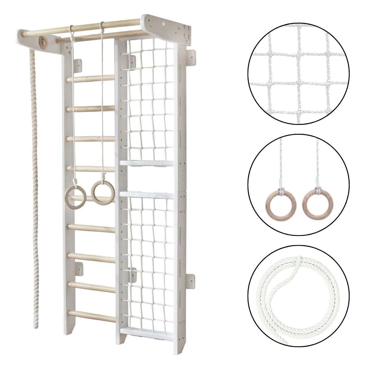 Kombikova sobna lestev je pravi opičji gaj za male opice. Stenski komplet vključuje tako gimnastično lestev kot plezalno mrežo, ki podpirata otrokov motorični razvoj. Lestev ima maksimalno obremenitev 100 kg, zato jo lahko uporabljajo tudi odrasli. Gimnastični set je izdelan iz naravnih materialov in je varen za otroke. Elegantna barvna shema se bo zlahka vključila v sodobno notranjost.
