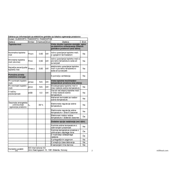 MILL GL600WIFI3V 600W Wi-Fi panelni konvekcijski radiator