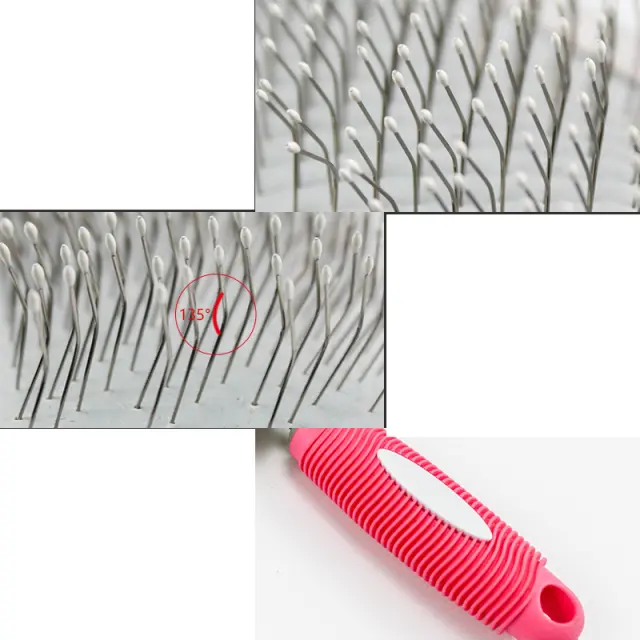 Nežno razčesavanje: Ta glavnik za hišne ljubljenčke ima ščetine iz nerjavečega jekla z zaobljenimi konicami, ki nežno razvozlajo vozle in preproge, ne da bi opraskale kožo vašega ljubljenčka. Ščetine so zasnovane tako, da prodrejo globoko v dlako, odstranijo odpadlo dlako in spodbujajo zdravo cirkulacijo.