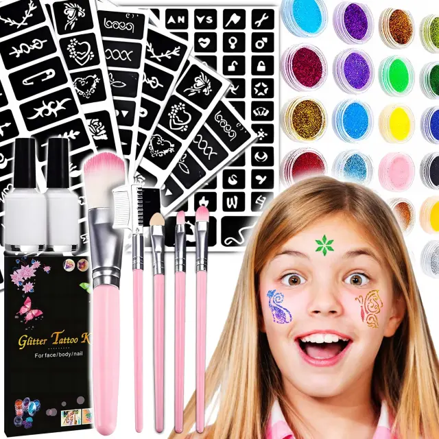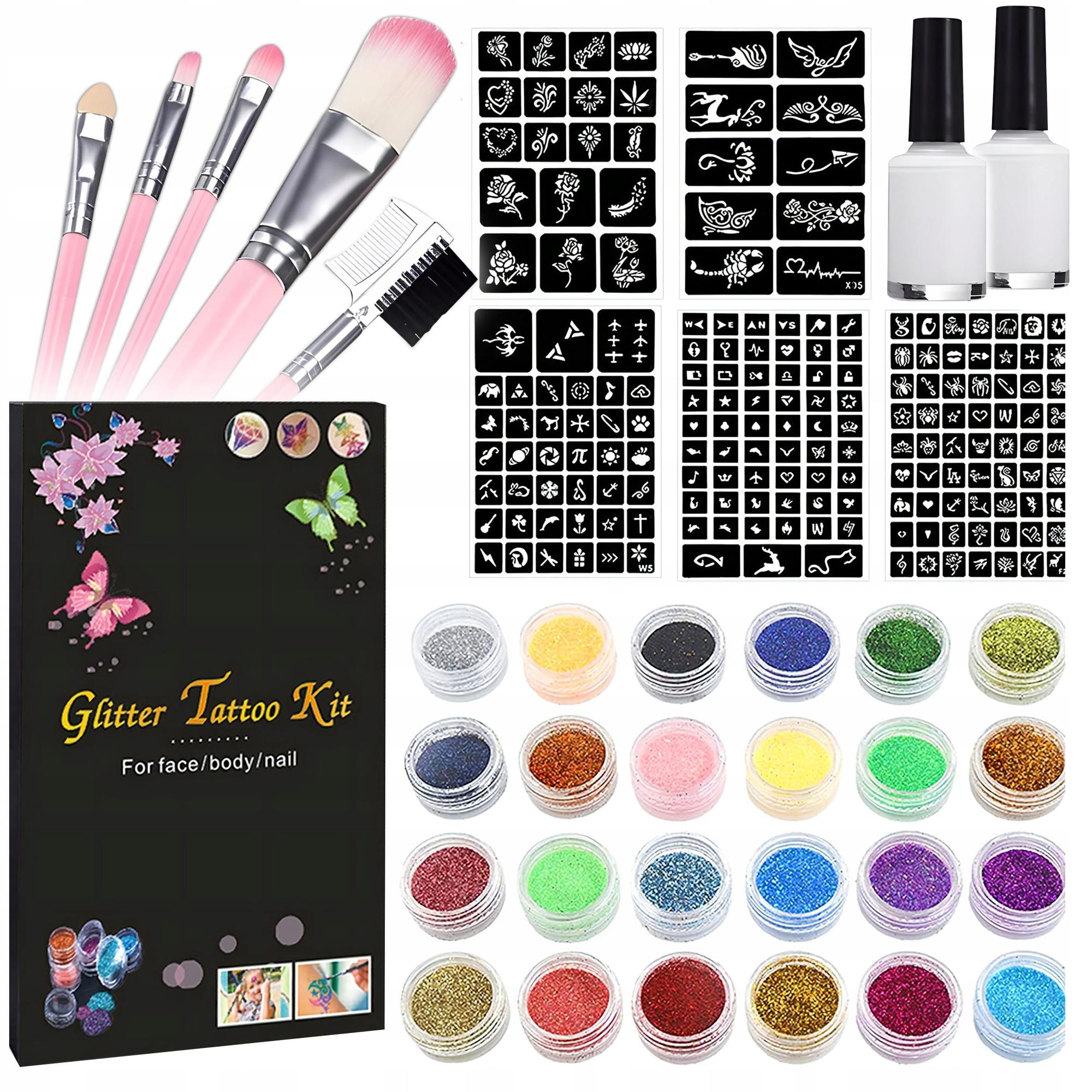 SET – kar 120 šablonov na vzorce, 24 posodic s pisanimi bleščicami, 2 steklenički lepila in čopiči na nanašanje