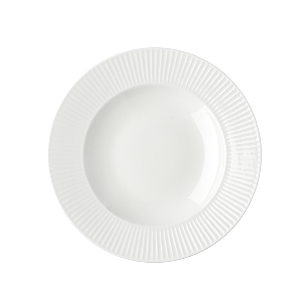 Globok krožnik iz belega porcelana z reliefnimi črtami na robovih, ki je prepoznavni znak celotne linije Reale, predstavlja popolno združitev elegance in funkcionalnosti. Krožnik je izdelan iz kakovostnega porcelana New Bone China, ki slovi po izjemni trpežnosti in odpornosti. Dizajn je prefinjen in minimalističen, pri čemer reliefne črte na robovih dodajo subtilen, a izrazit element estetike. Krožnik premera 22 cm je primeren za različne priložnosti, od vsakodnevne uporabe do posebnih dogodkov in praznovanj. Njegova bela barva in čiste linije omogočajo, da se odlično ujema s katerim koli dekorjem in poudari postreženo hrano. Zaradi uporabe porcelana New Bone China je lahek, a hkrati trpežen in primeren za pomivanje v pomivalnem stroju ter uporabo v mikrovalovni pečici. Ne glede na to, ali gre za običajno večerjo ali posebno priložnost, bodo krožniki iz belega porcelana z reliefnimi črtami na robovih iz linije Reale zagotovo dodali dotik elegance in stila vaši mizi. NAMIG: Dopolnite ga z ostalimi izdelki iz iste linije.