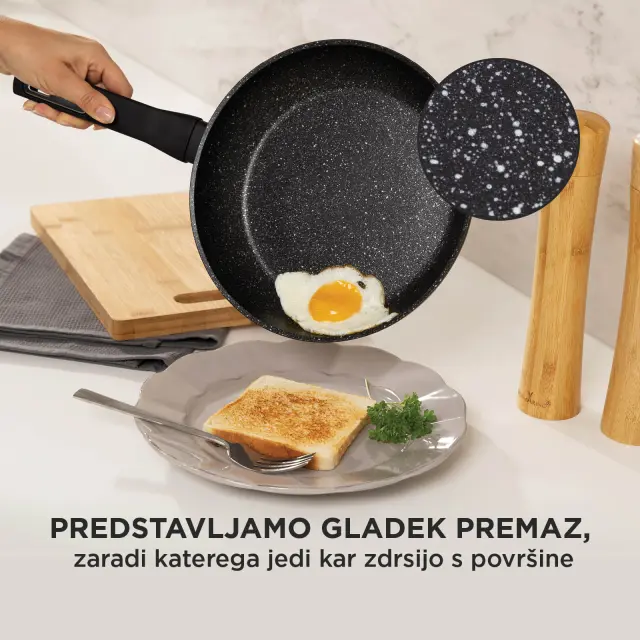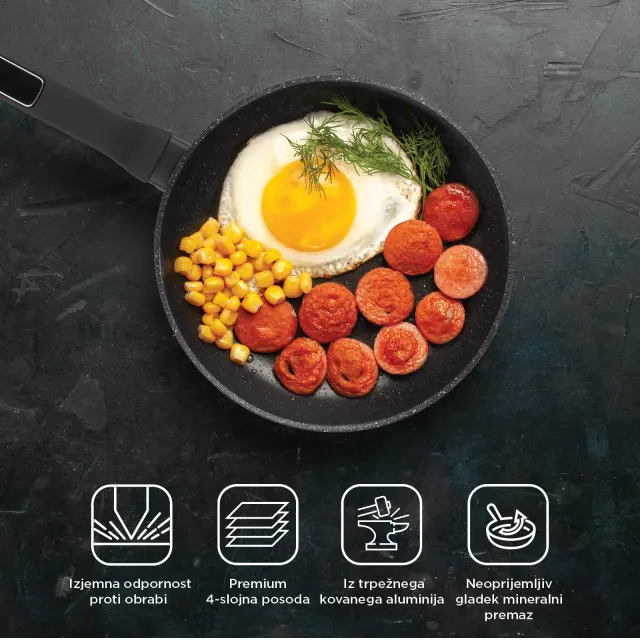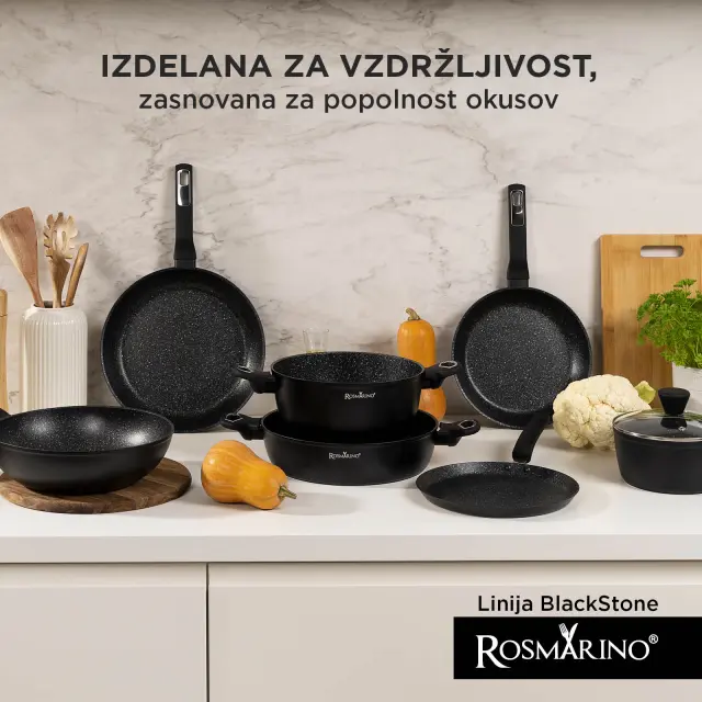 Posoda BlackStone je namenjena vsem, ki v svoji kuhinji iščejo popolno ravnovesje med vrhunsko kakovostjo in zmogljivostjo. Celotna linija temelji na inovativni 4-slojni sestavi z jedrom iz robustnega kovanega aluminija, ki je izredno trpežen in zagotavlja enakomerno porazdelitev toplote za popolne rezultate kuhanja pri vsaki uporabi. Za boljšo trdnost in odpornost proti obrabi poskrbi poseben marmorni premaz z mineralnimi delci, ki posodi daje tudi njen eleganten, premium videz. Zaradi inovativnega neoprijemljivega mineralnega premaza lahko kuhaš z minimalno količino maščobe in pripraviš zdrave ter okusne obroke, ki ohranijo vse potrebne hranilne snovi, vitamine in minerale. Posoda BlackStone, primerna za vse kuhalne površine, vključno z indukcijo, bo s svojo vsestranskostjo, trpežnostjo in dovršenim videzom navdušila tako ljubiteljske kot profesionalne kuharje.