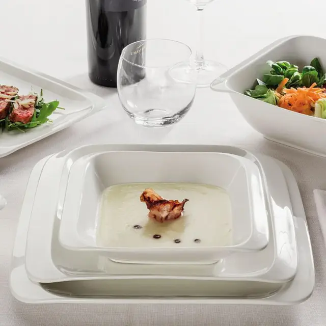 Globok krožnik Infinity je izdelan je iz belega porcelana, ki je odporen na praske, udarce in vsakodnevno uporabo. Njegova oglata oblika je značilna za kolekcijo Infinity, kar zagotavlja prefinjen in moden pridih vsaki mizi. Idealen je za serviranje juh, enolončnic, testenin, rižot ter solat in hladnih jedi. Primeren je za pomivanje v pomivalnem stroju in uporabo v mikrovalovni pečici.