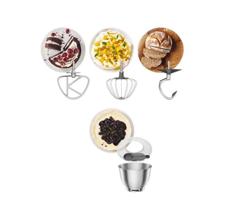 Kuhinjski aparat Kenwood Go ima tri zelo učinkovite nastavke: K-Beater metlico, stepalnik in kljuka za testo, vse iz trpežnega aluminija, s posebnim nastavkom za mešanje, sekljanje in mletje ter šestimi hitrostmi za natančno mešanje različnih vrst testa in zmesi.