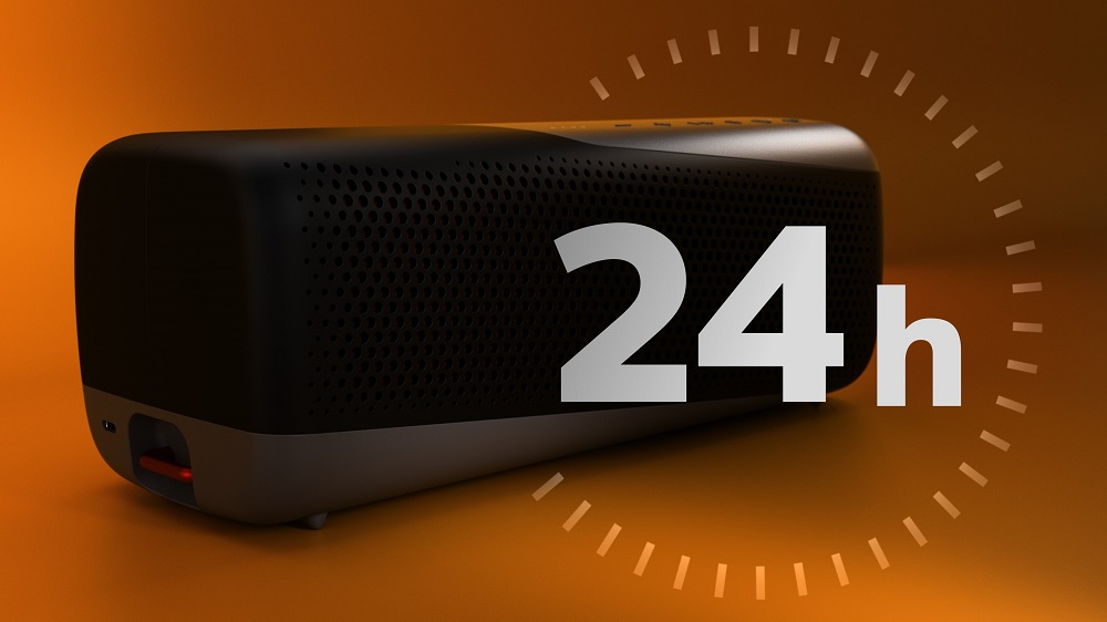 Želite glasnejše predvajanje? Zvočniku ne bo zmanjkalo energije prej, kot vam. S povsem napolnjenim zvočnikom lahko glasbo predvajate 24 ur in s funkcijo polnilne postaje brez prekinitve predvajanja napolnite tudi priklopljene naprave.