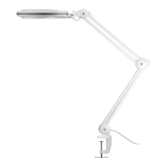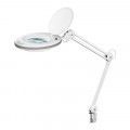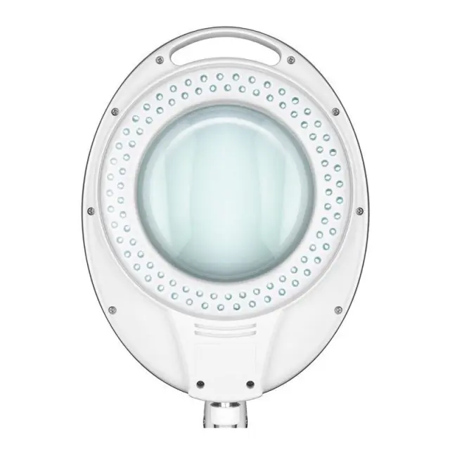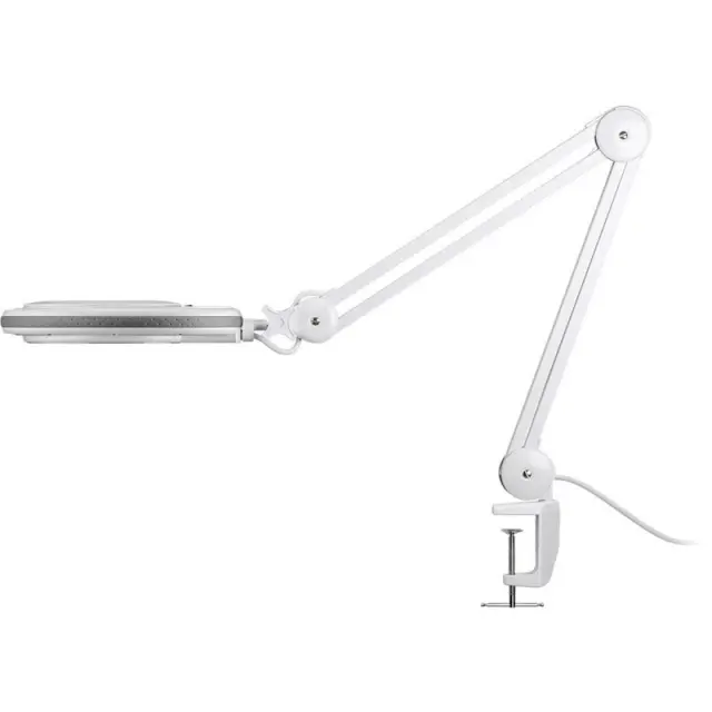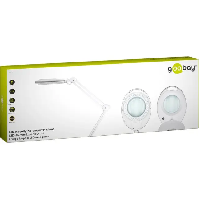 GOOBAY povečevalna LED namizna svetilka nudi povečevalno lupo v premeru 127 mm z LED osvetlitvijo obroča, ki ne meče senc. Steklena leča ima 3 dioptrije, nudi 1,75x poveč evaje in ima zaščitni pokrov. Dvojni zgibni nosilec ima 700 mm delovnega polmera in se ga lahko namesti na delovno površino debeline do 60 mm z objemko. Povečevalna lupa se lahko nagne za do 90° in se zasuka za 360°.