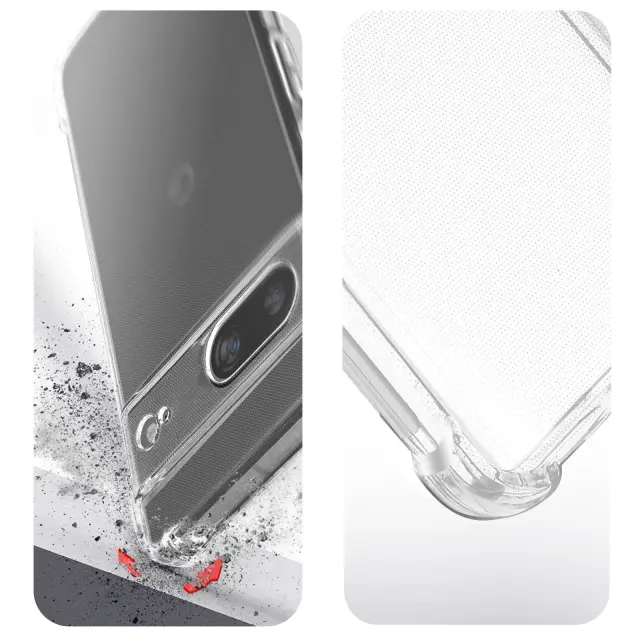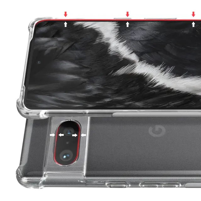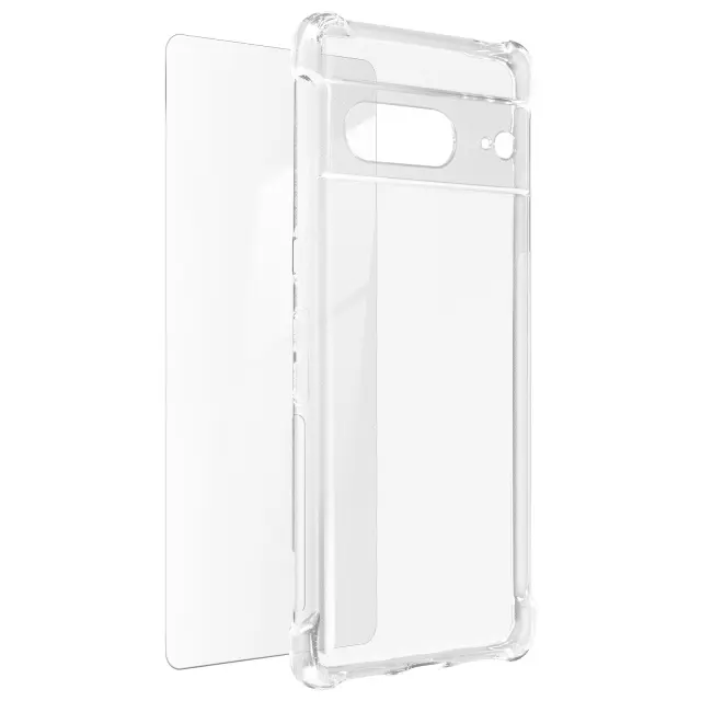 Vrhunski zašcitni paket Google Pixel 7 popolnoma zašciti vaš pametni telefon. Ohišje z ojacanimi vogali, ki pušca vidno obliko mobilnega telefona. Film iz kaljenega stekla 9H proti prstnim odtisom ohranja zacetne lastnosti zaslona.