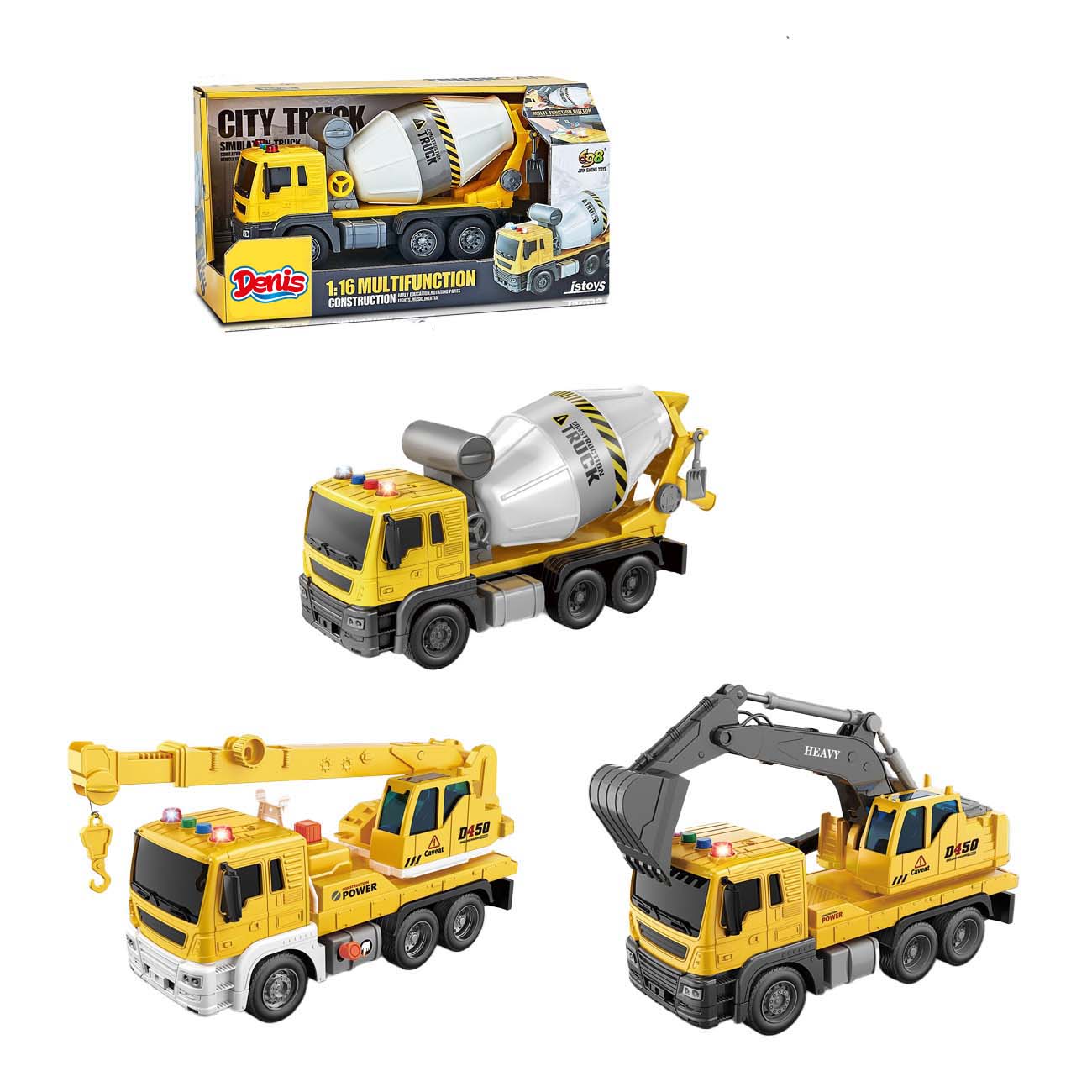 Atraktivni gradbeni tovornjaki omogočajo otrokom priložnost za igro in posnemanje sveta odraslih oseb. Na voljo so tri vrste tovornjakov: mešalnik, bagri in dvigalo. Ta vozila avtentično prikazujejo gradbeno industrijo, omogočajo pa otrokom, da se počutijo kot del vznemirljivih gradbenih projektov, medtem ko načrtujejo svoje podvige. Ti impresivni gradbeni tovornjaki niso običajne igrače, ampak predstavljajo pravi vir dogodivščin za otroke. Zvočni in svetlobni učinki, skupaj z mnogimi gibljivimi deli, zagotavljajo realistično igro ter neskončne ure zabave.