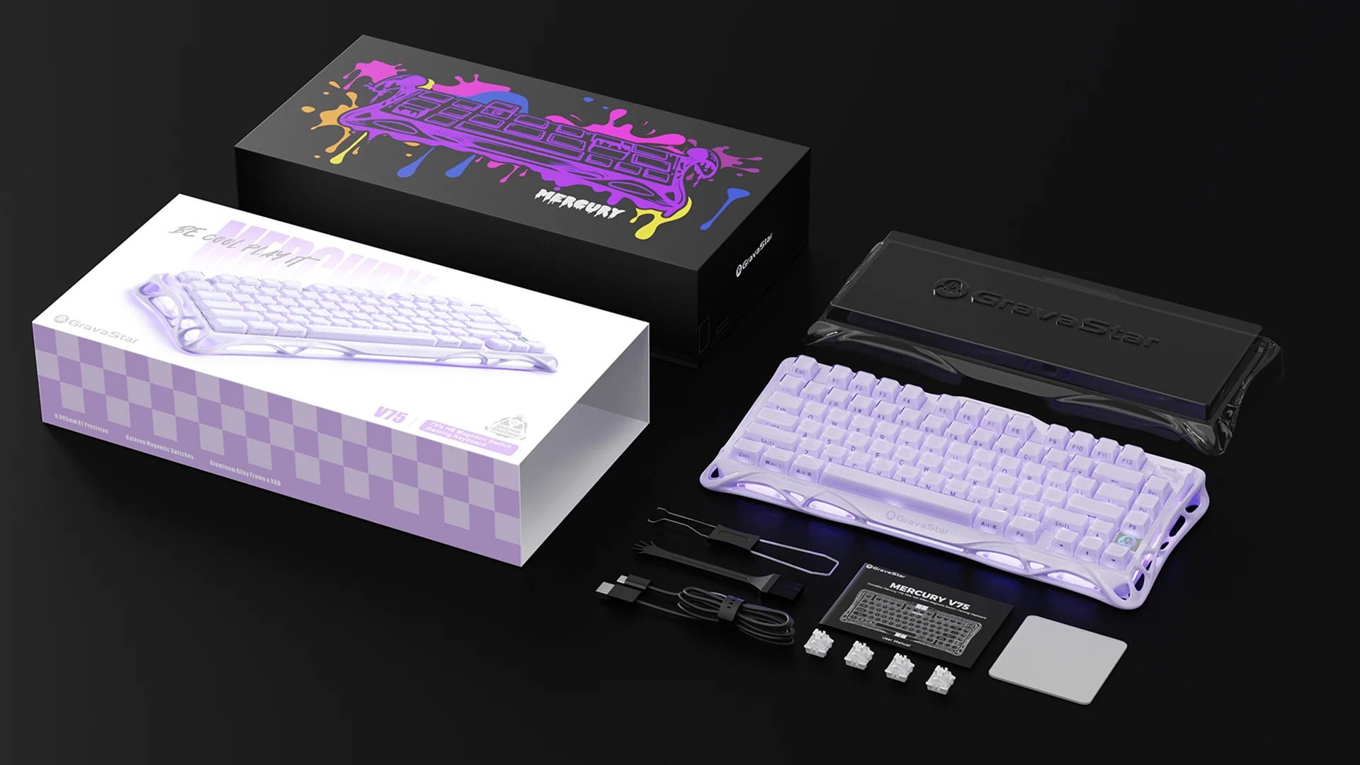 GravaStar Mercury V75 Lavender Purple je žična magnetna tipkovnica, zasnovana za popolno natančnost. Z resničnim odčitavanjem 8 kHz, ledeniško belimi stikali z natančnostjo 0,005 mm in nastavljivim pritiskom zagotavlja bliskovito hiter odziv. S hitrim proženjem, zasnovo, ki jo je mogoče zamenjati med delovanjem, polaluminijastim ohišjem, akustično peno in 16-hodno osvetlitvijo RGB združuje slog in profesionalno zmogljivost.