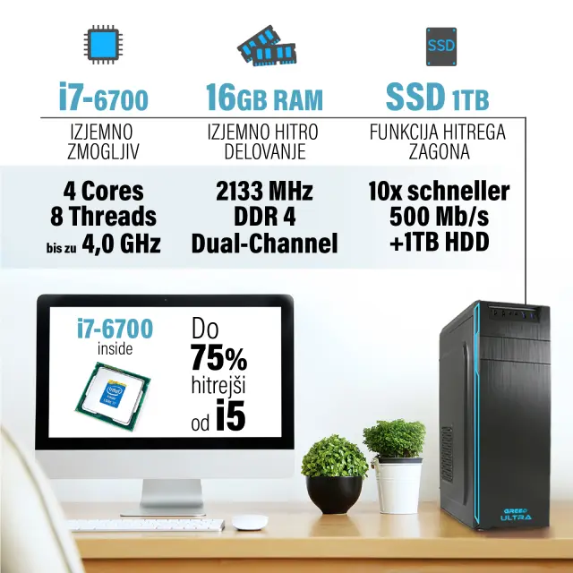 Greed® Ultra 7 PC - namizni / pisarniški računalnik - Intel Core i7 6700 - 4,0 GHZ - 16GB RAM - 1TB SSD + 1TB HDD - DVD+RW - USB3.0 - WLAN - Win11 Pro