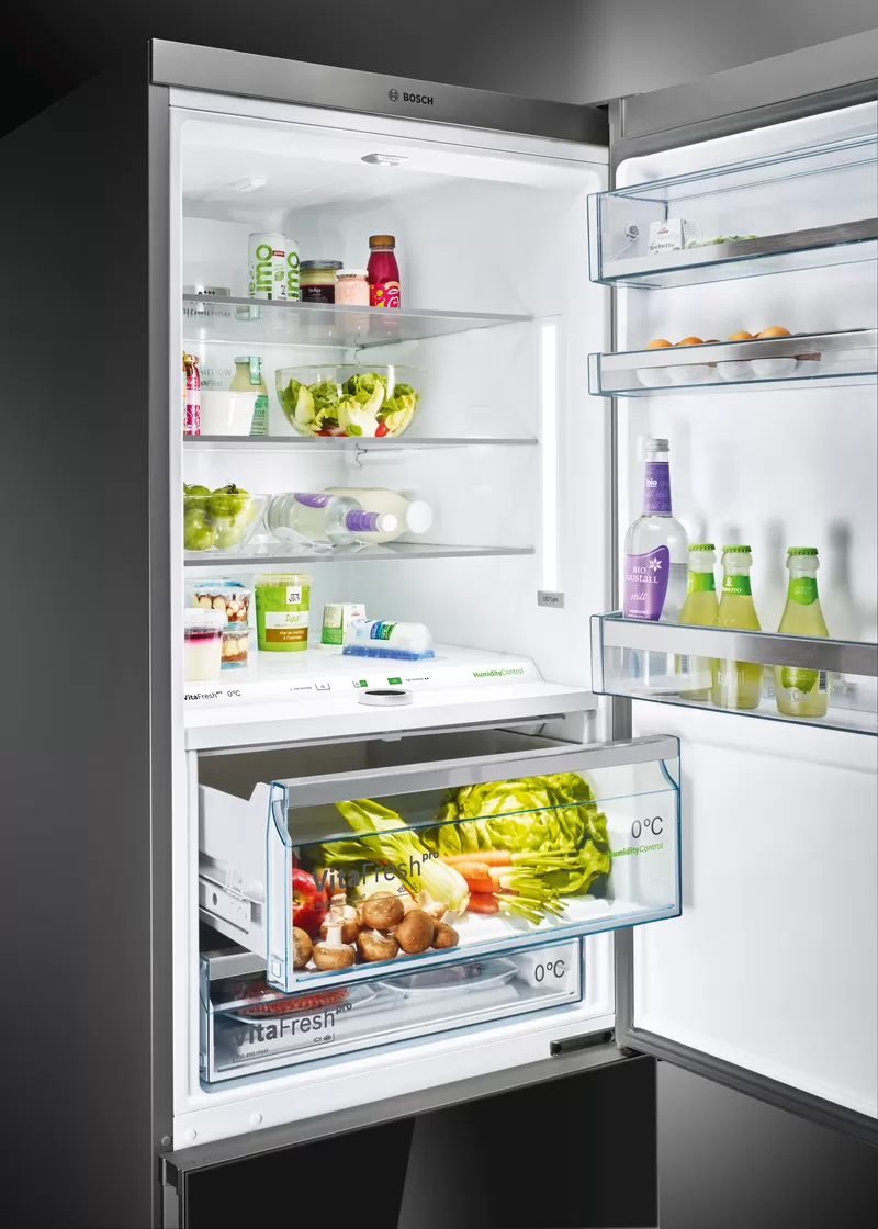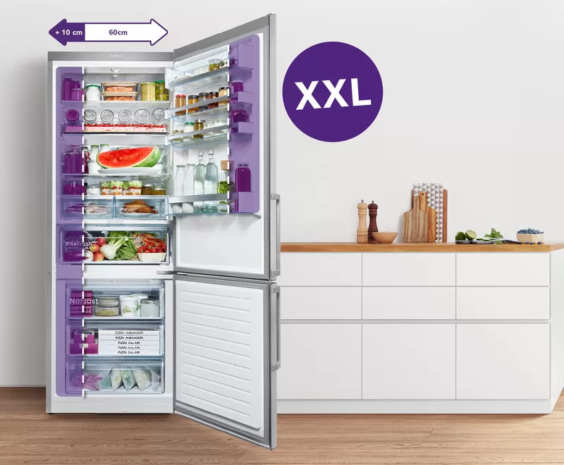 Majhna razlika v centimetrih, a velika razlika v prostornini: že majhna količina dodatnih centimetrov v širini v primerjavi s standardnim modelom vam dovoljuje, da v naše samostoječe kombinirane hladilnike z zamrzovalnikom spravite cele pekače, pa tudi velike lubenice in druge velike izdelke. Večja notranjost daje popoln pregled in maksimalno fleksibilnost.