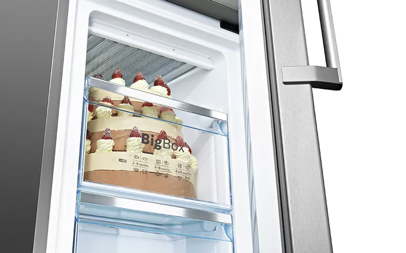Posebej globok predal za zamrznjena živila za praktično zlaganje posod z zamrznjenimi živili ali večjih zamrznjenih živil, kot so torte ali pice. Ne glede na to, ali morate prirediti otroško rojstnodnevno zabavo ali zamrzniti poročno torto – v predalu BigBox boste našli dovolj prostora za večja zamrznjena živila.