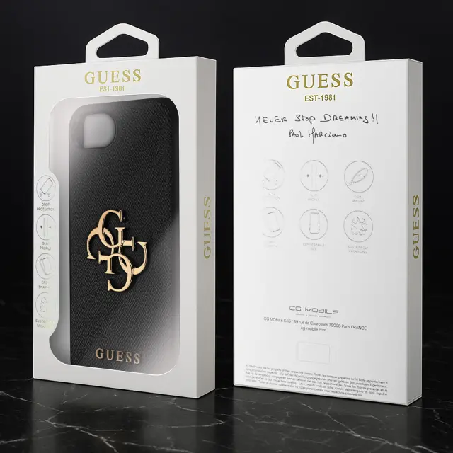 Eleganten etui za iPhone 16e iz serije Guess Grained Big 4G Logo. Obloženo z imitacijo usnja Saffiano, elegantno križno zrno. Velik zlat reliefni logotip 4G s kovinsko blagovno znamko GUESS. Tanka in lahka silhueta, zasnovana tako, da izboljša videz, ne da bi ga obtežila..