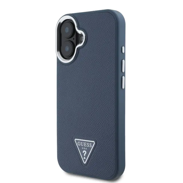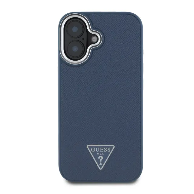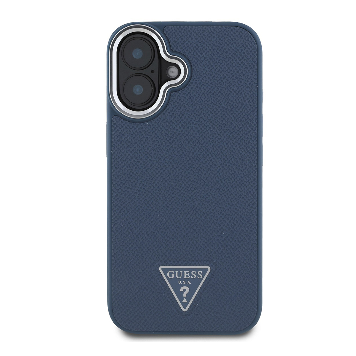 Guess, Šokotesno ohišje za iPhone 16 z zrnatim učinkom in trikotnim logotipom, Modra