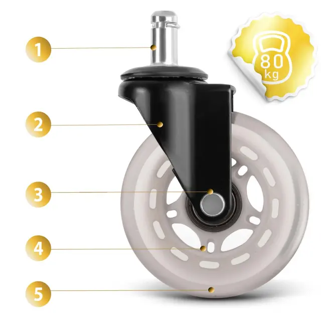 Tudi občutljiva tla ne bodo opraskana! Poleg tega kolesa delujejo izredno tiho in ne drsijo na terakoti, na preprogi pa se dobro obnesejo.