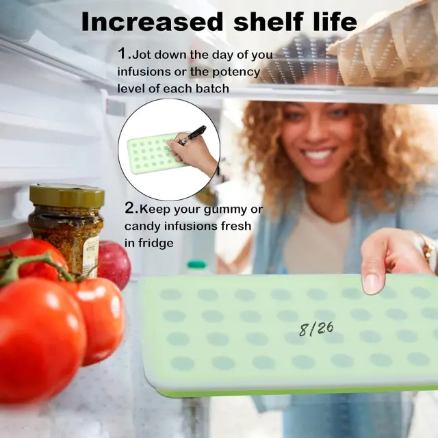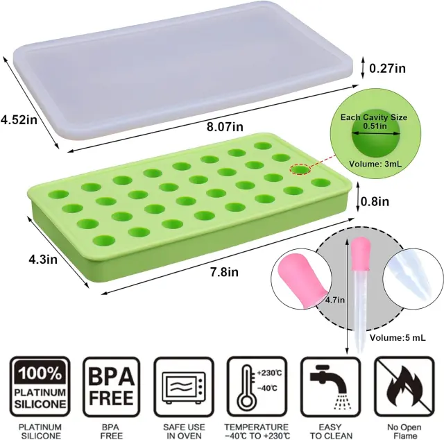 Silicone Fondant Molds: You will get 2 32-cavity silicone candy molds with lids. The package comes with 2 droppers. Fudge molds are great for making homemade pickles, making vanilla chunks, fudge, candies, chocolate and other snacks.SAFE LID: Our fudge molds feature dry-erase secure snap-fit lids to prevent spills, allowing you to keep your fudge or candy fresh in the refrigerator. You can note the day or potency level of the steeping process for each batchRELIABLE MATERIAL: Our gummy molds are made of high-quality environmentally friendly pure food-grade silicone, meeting American quality.Easy to use: The non-stick silicone candy tray is flexible and makes it easy to remove the candy from the mold. Silicone trays are also microwave, oven, refrigerator and dishwasher safe.【Widely Used】Silicone gummy molds are ideal for making and preserving essential oils, herbal cubes, gummy candies, candies, chocolates and other snacks. Cover and place in the refrigerator to extend shelf life.
