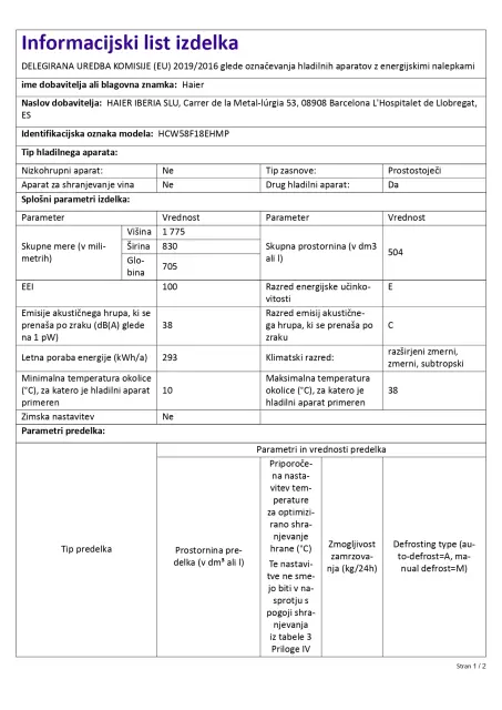 · Razpon temperature: hladilni predel: od 1 do 9 °C; zamrzovalni predel: od -24 do -14 ° C