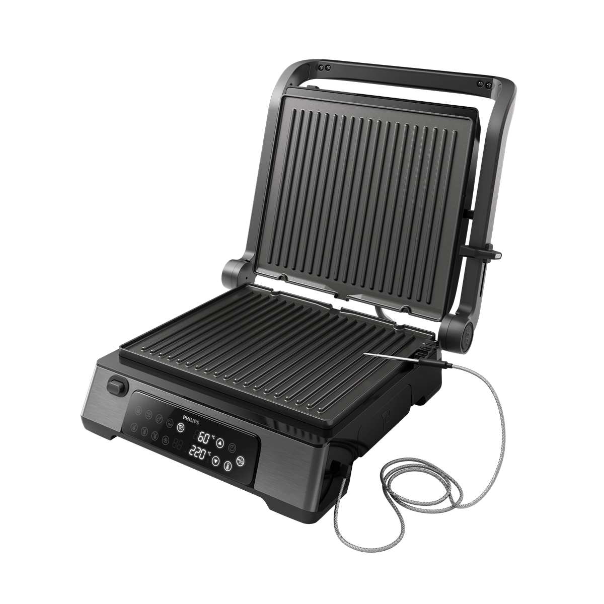 Natančno nastavite temperaturo, ki jo potrebujete za sočne in idealno pripravljene obroke. Specite sendviče, meso in zelenjavo na žaru tako, kot vam je všeč. Uživajte v žaru z 8 gumbi s prednastavitvami za odmrzovanje, pečenje hamburgerjev, rib, piščanca, zelenjave in mesa (rare, medium in well done).