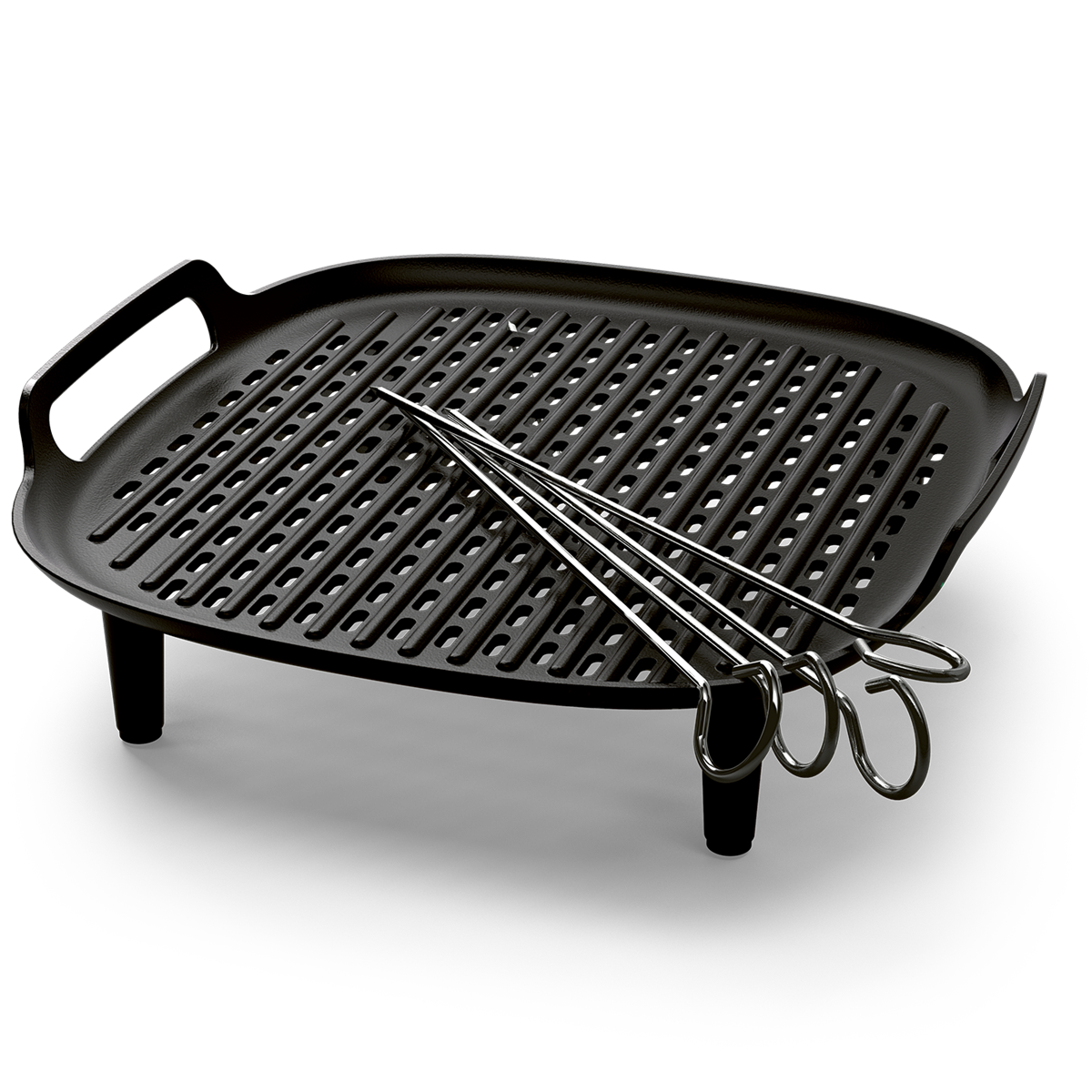 Plošča za žar z edinstveno luknjasto površino s prepoznavnimi robovi za popolno pečeno ribo, meso in zelenjavo. Nabodala uporabljajte za pripravo zelenjavnih ali mesnih ražnjičev.
