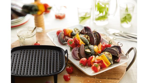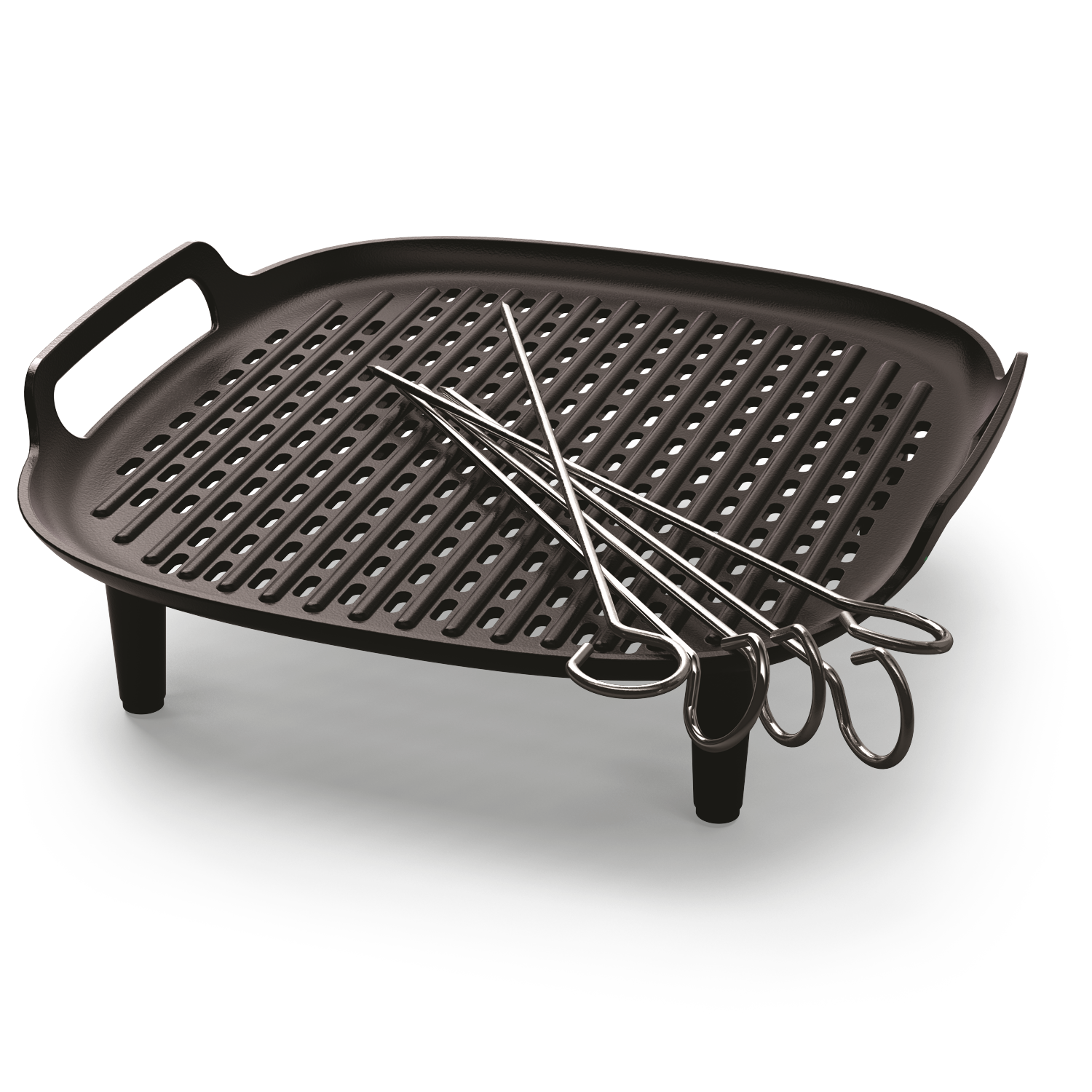 Plošča za žar z edinstveno luknjasto površino s prepoznavnimi robovi za popolno pečeno ribo, meso in zelenjavo. Nabodala uporabljajte za pripravo zelenjavnih ali mesnih ražnjičev.