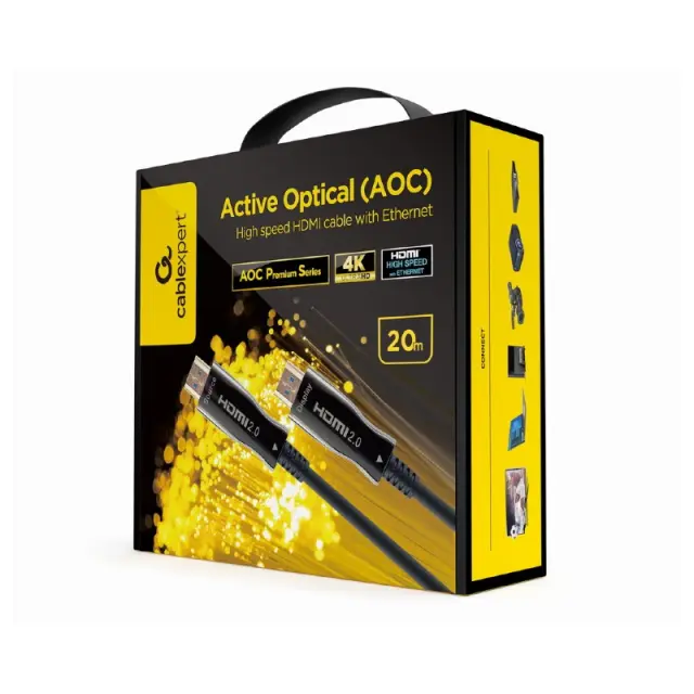Aktivni optični kabel HDMI (AOC) 20m uporablja tehnologijo optičnih vlaken za prenos digitalnega signala HDMI. To pomeni, da se lahko signal prenese veliko dlje kot s tradicionalnim bakrenim kablom (do 100 m) in zmanjša tveganje motenj EMI/RFI. Kabli HDMI AOC imajo v notranjosti tudi namenske bakrene napajalne žice, tako da zunanje napajanje ni potrebno.