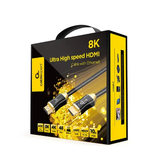 Premium visokohitrostni HDMI AOC kabel 10m z Ethernetom s podporo ločljivosti HDMI 2.1 8K UHD pri 60 Hz. Optični kabel z vzdržljivim najlonskim pletenjem je zelo odporen proti EMI in RFI motnjam. Pozlačeni kovinski konektorji zagotavljajo popolno kakovost slike. Združljiv z vsemi napravami, ki podpirajo HDMI.