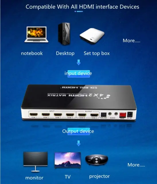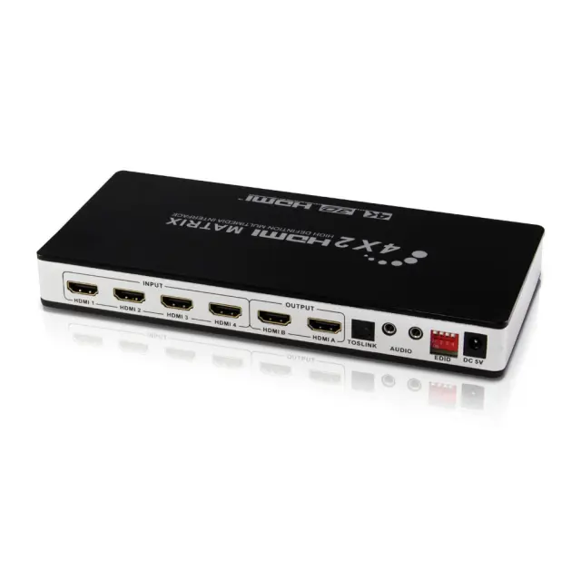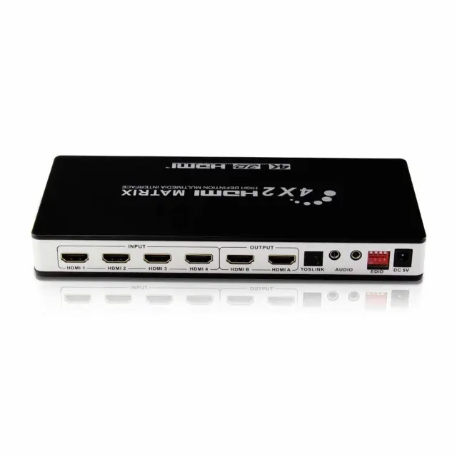 Praktično, produktivno in stroškovno učinkovito: to matrično stikalo 4x2 HDMI naredi vašo napravo bolj priročno ter bolj produktivno in stroškovno učinkovito. Omogoča povezavo štirih virov HDMI in dveh vrst avdio izhodov, optičnega (Toslink) ali stereo hkrati.