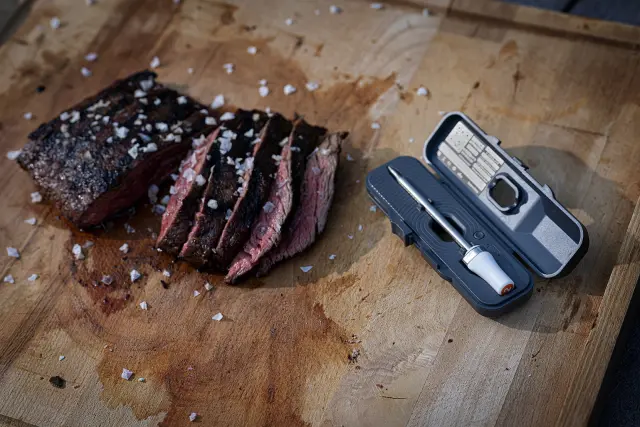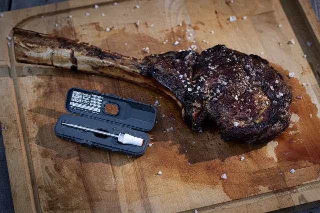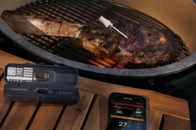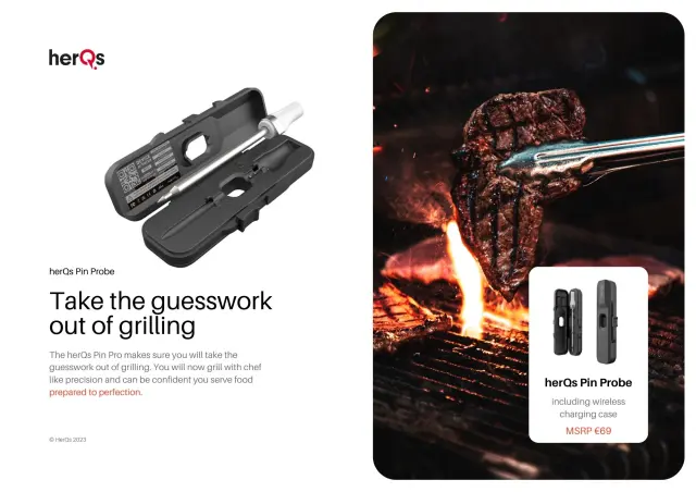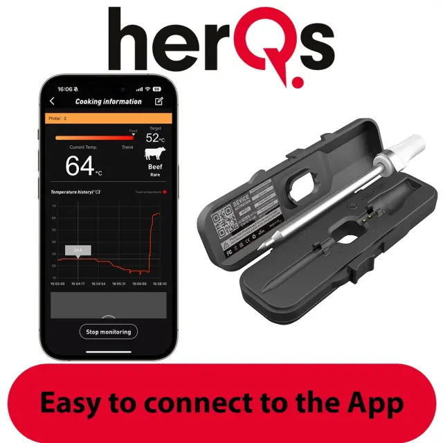 S sondo HerQs Pin Probe dobite izjemno enostaven za uporabo termometer za meso, ki je popolnoma brezžičen. Sondo herQs Pin Probe lahko povežete z aplikacijo herQs App, ki vam med pripravo jedi omogoča vse želene podatke. Seveda so v aplikaciji na voljo prednastavljene vrednosti, s katerimi lahko določite, kateri kos mesa pripravljate in kako ga želite skuhati. Sonda herQs Pin Probe je standardno opremljena s priročnim polnilnim ohišjem, zato jo lahko po uporabi preprosto obrišete z vlažno krpo in položite nazaj v polnilno ohišje, da se sama napolni in je pripravljena na naslednjo pripravo.
