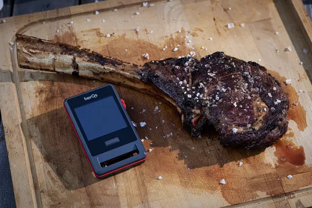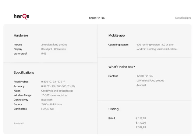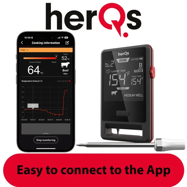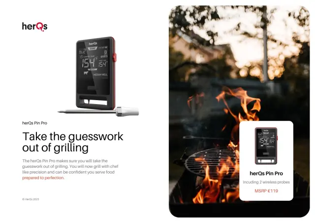 Z napravo HerQs Pin Pro dobite izjemno enostaven za uporabo termometer za meso, ki je popolnoma brezžičen. Sondo herQs Pin Probe lahko povežete z aplikacijo herQs App, ki vam med pripravo jedi omogoča vse želene podatke. Seveda so v aplikaciji na voljo prednastavljene vrednosti, s katerimi lahko določite, kateri kos mesa pripravljate in kako ga želite speči. HerQs Pin Pro je standardno opremljen z 2 brezžičnima sondama, ki sta shranjeni na zadnji strani. Tam se tudi polnita. Po uporabi brezžični sondi obrišite z vlažno krpo in ju položite nazaj na hrbtno stran, da se sondi napolnita in sta pripravljeni na naslednjo pripravo.